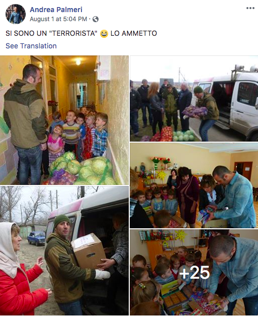 Сам Пальмери на своей странице в Facebook писал, что помогает жителям Донбасса. Он публиковал фото, как развозит продукты от благотворительной организации, и с сарказмом подписал их: "Да, я террорист, признаюсь".