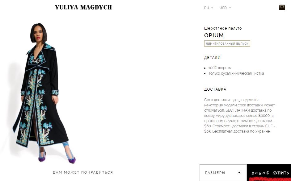 Модель платья-пальто нардепа Ионовой из лимитированной серии называется "Опиум" и стоит $3050 или 78 тыс. грн по курсу НБУ на 28.08.2017 г. Выполнено из 100% шерсти.
