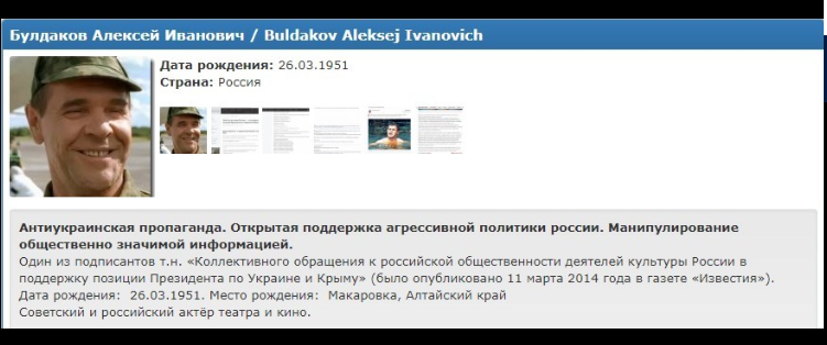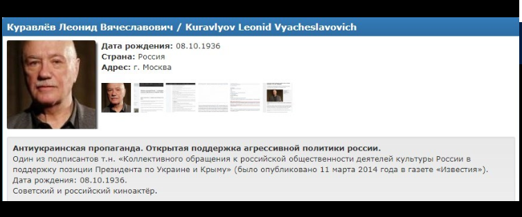 Знаментые российские актера Леонид Куравлев ("Иван Васильевич меняет профессию", "Афоня", "Живет такой парень") и Алексей Булдаков ("Особенности национальной рыбалки") попали в базу центра "Миротворец".