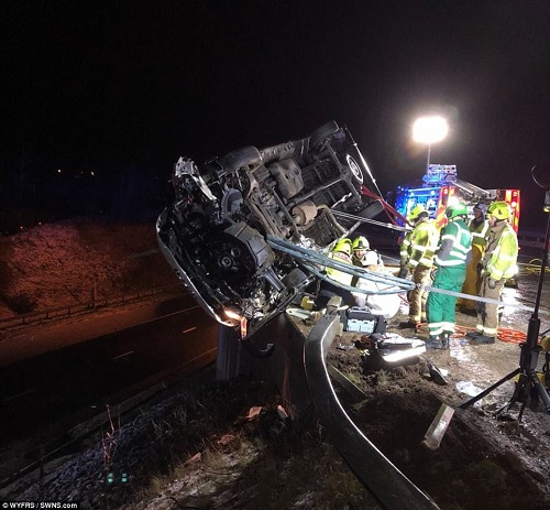 ЧП произошло в графстве Уэст-Йоркшир, рядом с городом Лидс. Водитель фургона не справился с управлением, его машина перевернулась и чуть не упала с моста.