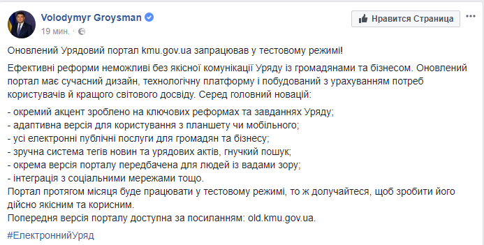 "Эффективные реформы невозможны без качественной коммуникации правительства с гражданами и бизнесом. Обновленный портал имеет современный дизайн, технологическую платформу и построен с учетом потребностей пользователей и лучшего мирового опыта", - пишет Гройсман.