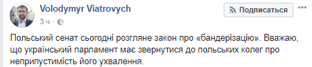 Вятрович призвал Раду не допустить принятия Польшей "закона о бандеризации"