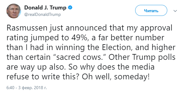 "Этот показатель гораздо лучше того, который я получил, одержав победу на выборах, и выше, чем у определенных "священных коров", - написал Трамп в микроблоге, добавив, что его популярность растет и по результатам других опросов.