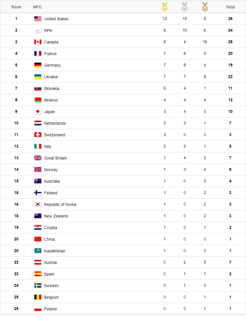 В общекомандном зачете "сине-желтые" заняли шестое место вслед за сборной США (13 золотых, 15 серебряных, 8 бронзовых), командой независимых паралимпийских атлетов (NPA) - 8, 10, 6, представителями Канады - 8, 4, 16, Франции - 7, 8, 5 и Германии - 7, 8, 4. Всего в Пхёнчхане медали завоевали представители 26 стран из 49 команд-участниц.