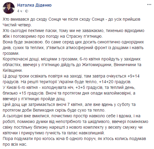 Синоптик Наталья Диденко прогнозирует теплую и сухую погоду на пасхальные выходные, однако, в пятницу будет идти дождь. Об этом она сообщила на своей странице в Facebook.