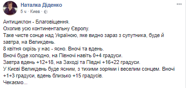Об этом сообщает синоптик Наталья Диденко на странице в Facebook.