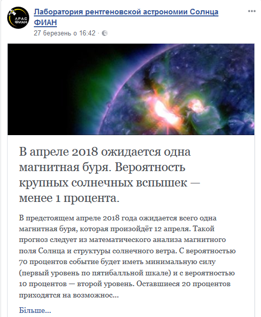 "Во втором весеннем месяце 2018 года ожидается всего одна магнитная буря, которая произойдет в четверг, 12 апреля. Такой прогноз следует из математического анализа магнитного поля Солнца и структуры солнечного ветра. С вероятностью 70 процентов событие будет иметь минимальную силу (первый уровень по пятибалльной шкале) и с вероятностью 10 процентов - второй уровень. Оставшиеся 20 процентов приходятся на возможность наблюдения в этот день более слабых магнитных возмущений.