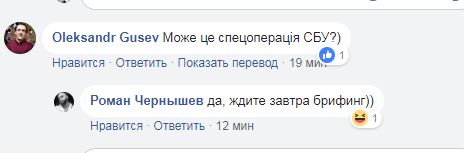В комментариях к видео Oleksandr Gusev пошутил, что это "может спецоперация СБУ", намекая на постановку со смертью журналиста Аркадия Бабченко. В ответ на это Чернышев в шутку пообещал "завтра брифинг".