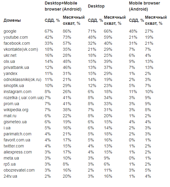 Согласно исследованию, за май пятью самыми популярными по посещаемости в Украине доменами стали Google, Youtube, Facebook, "ВКонтакте" и Ukr.Net.