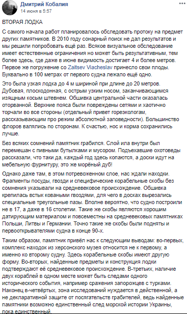 "Это была узкая лодка до 4 метров в ширину при длине до 20 метров. Дубовая, плоскодонная, с острым узким носом, заканчивающееся изящным косым штевнем. Обшивка крепилась встык коваными гвоздями, для чего в досках вырезались специальные треугольные пазы. Вполне вероятно, что судно построили не в XVII, а даже в XVI веке. Такие скобы являются хорошим датирующим материалом и распространены на средневековых памятниках Польши, Литвы и Германии. Нос и корма сохранились лучше", - написал Дмитрий Кобалия.