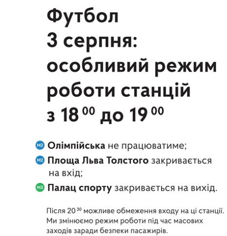 Киевский метрополитен напоминает, что в день матча перейдет на особый режим работы. С 18:00 до 19:00 станция Олимпийская не будет работать. Станции Льва Толстого и Дворец Спорта будут закрыты на вход. После 20:00 возможно ограничение входа на этих станциях.