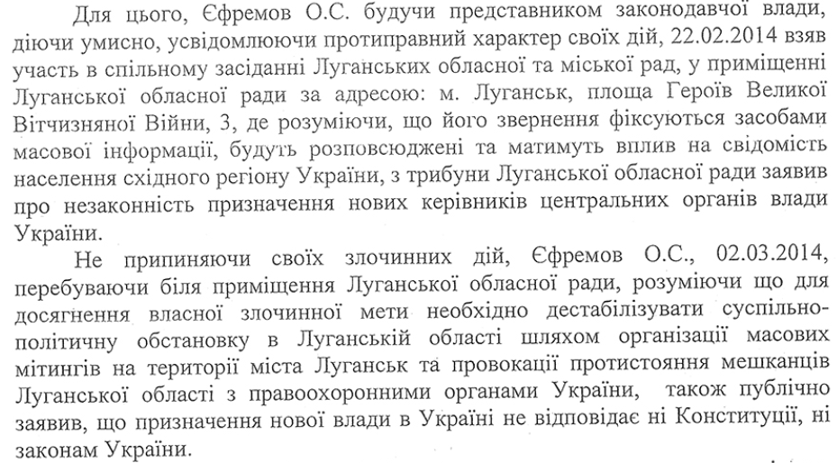 Суть обвинения в том, что Ефремов якобы подговаривал чиновников Луганской ОГА захватить ее, установив незаконную власть.