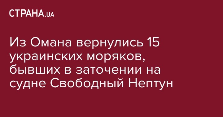 Сегодня, 30 июля, в Украину из Омана вернулись 15 членов экипажа судна-банкрота Free Neptune (флаг Либерии). Об этом сообщает пресс-служба профсоюза работников морского транспорта Украины (Одесса).