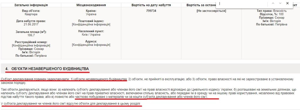 В декларации Сюмар за 2017 этого дома, который не введен в эксплуатацию, нет. Аналогично и в предыдущих декларациях. Это означает, что либо Сюмар как субъект декларирования не внесла не введеный в эксплуатацию дом, на строительство которого она давала средства, и нарушила этим антикоррупционное законодательство, или она не давала средства на строительство дома, и тогда не было вносить это в свою декларацию.