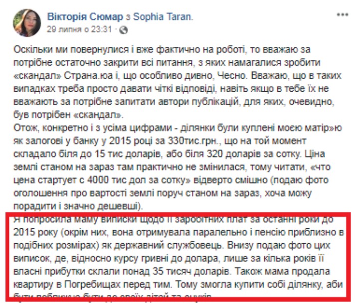 Однако, Общественное движение Честно отмечает, что проверило доходы матери Виктории Сюмар и выяснило, что их уровень недостаточен для того, чтобы купить участок и построить дом вблизи столицы. Более того, как видно из фото дома, который не введен в эксплуатацию, он уже обжитой.