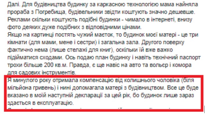 А по состоянию на начало 2016 дом матери нардепа был уже полностью построен. Продажа квартиры в Погребищах (городок, удаленный от Винницы более чем на полсотни километров) не мог окупить строительство дома с нуля под Киевом, установка забора на участке, несколько меньшей чем полгектара и создание искусственного водоема.