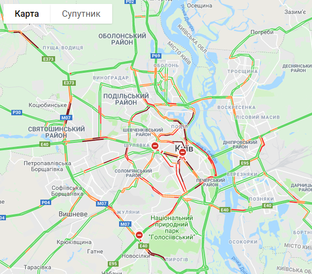 В понедельник, 20 августа, центр Киева скован автомобильными пробками. Об этом свидетельствуют данные сервиса Google Maps.