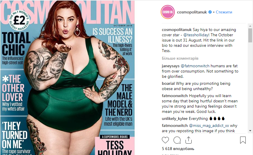 Модель plus-size Тесс Холлидей появилась на обложке британской версии журнала Cosmopolitan. Фото опубликовано в Instagram издания.