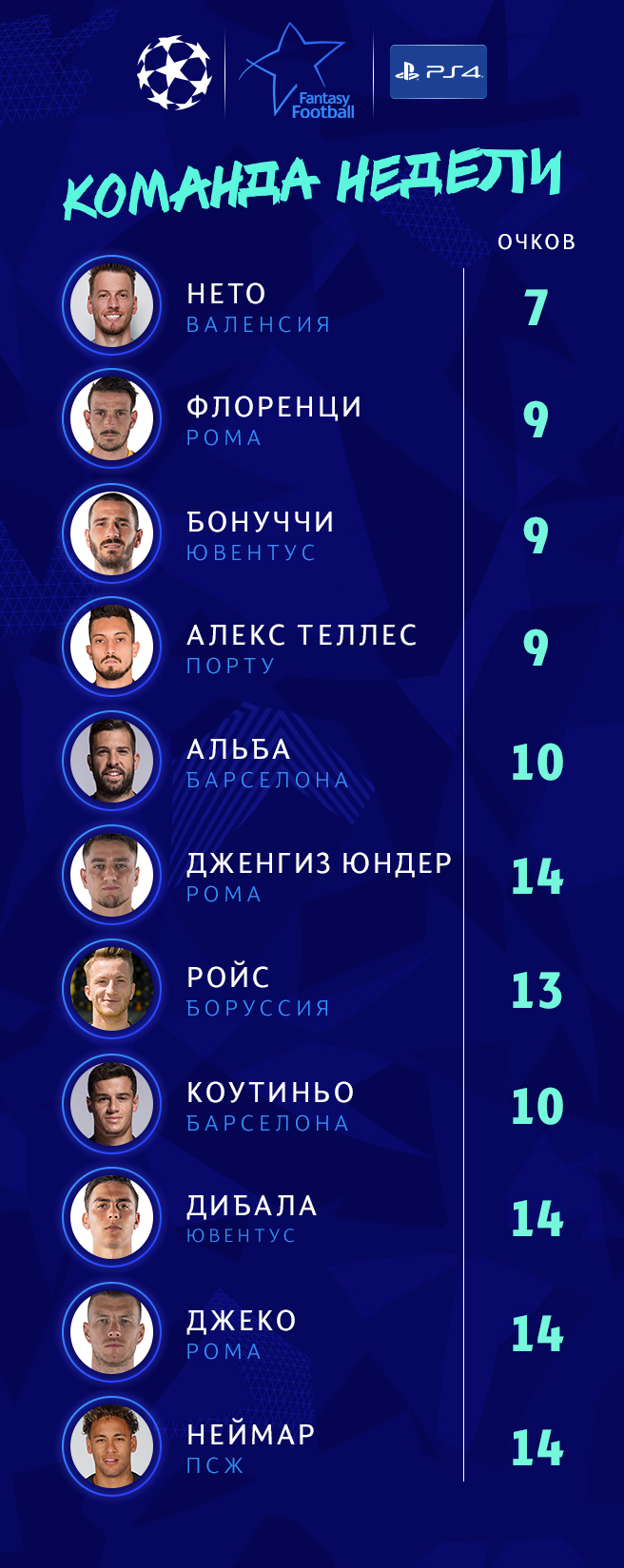 В УЕФА пояснили, что символическая сборная формируется из футболистов, набравших в матчах на этой неделе наибольшее количество очков в игре Fantasy Football по Лиге чемпионов от PlayStation. При равном количестве очков в туре выбирались игроки с более низкой трансферной ценой в игре Fantasy.