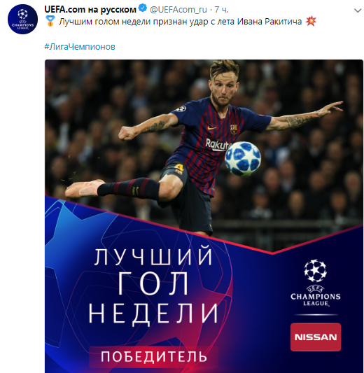 Лучшим голом второго тура группового этапа Лиги чемпионов УЕФА 2018-19 признан удар с лета хорвата Ивана Ракитича в матче "Тоттенхэм" - "Барселона", который завершился победой испанцев - 2:4.