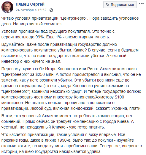 В условиях продажи говорится о том, что государство после приватизации должно компенсировать покупателю убытки. И здесь, по его мнению, и заложены основные риски. "Перевожу: купил себе Игорь Кононенко или Ринат Ахметов компанию "Центрэнерго" за $250 млн. А потом присмотрелся и выяснил, что он не заметил, как у него возникли убытки. Эти убытки возникли еще во времена государства (то есть, когда Кононенко рулил схемами на "Центрэнерго"). И теперь государство должно компенсировать частному инвестору Кононенко/Ахметову $100 миллионов. Не платить нельзя - прописано в положении о приватизации. Любой суд, включая Лондонский, скажет: Украина, плати", - пишет Лямец.