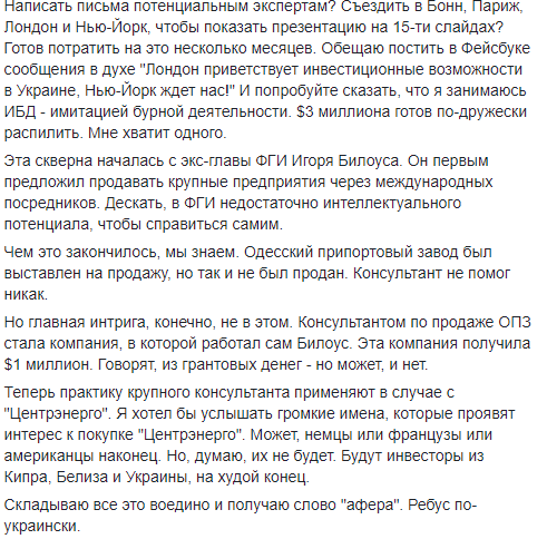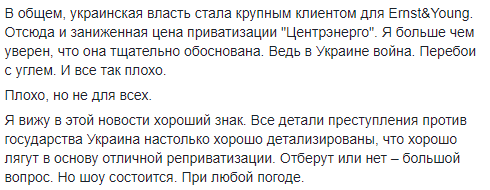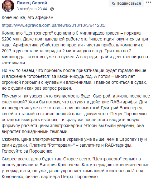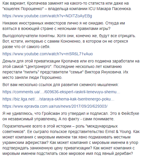 "Скорее всего, "Центрэнерго" сольют в пользу Виталия Кропачева, который уже давно управляет компанией в интересах Игоря Кононенко, бизнес-партнера Петра Порошенко, - пишет Лямец. - Деньги для этой приватизации Кропачев или его подмена заработали на этой самой "Центрэнерго". Последние несколько лет компанию перестали "пилить" представители "семьи" Виктора Януковича. Их место заняли люди Порошенко".