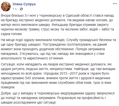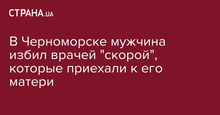 В Черноморске Одесской области пьяный мужчина напал на бригаду экстренной медицинской помощи, приехавшей на вызов к его матери. Об этом сообщает и.о. министра здравоохранения Ульяна Супрун на своей странице в Facebook.