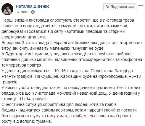 "На протяжении 3-4 ноября в Украине ни бесконечных дождей, ни штормового ветра, ни снега, ни даже маленьких "минусов" не будет. А будут красивые туманы, в воскресенье на западе и севере какие-то районные слабенькие дождики местами, повышенное атмосферное давление и комфортная температура воздуха", - отмечает синоптик.