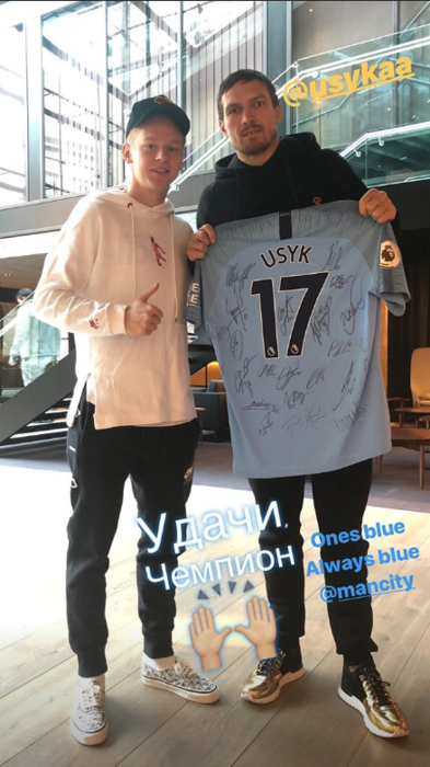 Футболист подарил боксеру футболку "Манчестер Сити" с любимым номером Усика 17. Также на ней красуются автографы игроков команды. Снимок выложен в сториз в Instagram Зинченко. Его он подписал лаконично: "Удачи, чемпион!"