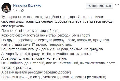 "Тут народ взволновался от медийной волны, что 17 февраля в Киеве наблюдалась самая высокая средняя суточная температура за весь период наблюдений", - написала она. И объяснила, что "ничего уж чрезвычайного" не произошло".