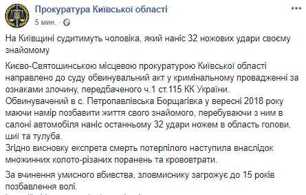 "Обвиняемый в с. Петропавловская Борщаговка в сентябре 2018 намереваясь лишить жизни своего знакомого, находясь с ним в салоне автомобиля нанес последнему 32 удара ножом в область головы, шеи и туловища", - говорится в сообщении..