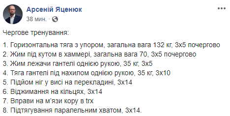 Сегодня, 8 мая, украинский политик, глава "Народного фронта" Арсений Яценюк продолжил серию публикаций своих тренировок из спортзала. Очередное видео занятий он опубликовал на своей странице в Facebook.