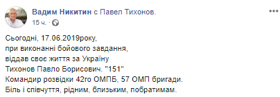 Наш военный погиб в понедельник, 17 июня. Павел Тихонов с позывным "151" был командиром разведки 42-го ОМПБ 57-й ОМПБр.