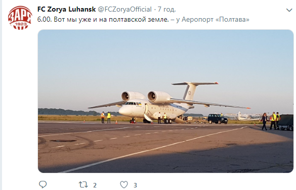 Официальный Twitter команды показал момент приземления в аэропорту Полтавы.