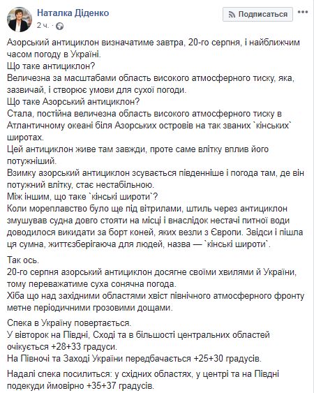 Наталья Диденко уточнила, что 20 августа Азорский антициклон достигнет своими волнами и Украины, поэтому будет преобладать сухая солнечная погода. Однако над западными областями хвост северного атмосферного фронта принесет периодические грозовые дожди.