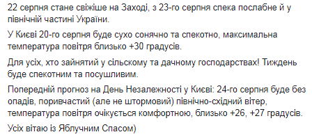 По словам синоптика, с 22 августа станет свежее на западе, с 23 августа жара ослабеет и в северной части Украины. В Киеве 20 августа будет сухо солнечно и жарко, максимальная температура воздуха около +30 градусов.