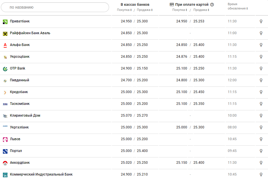 В банках курс доллара с утра был такой: покупка от 25 до 25,15 грн, продажа от 25,29 до 25,4 грн.