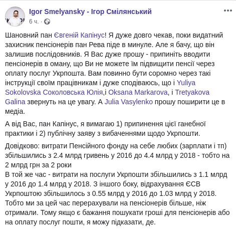 "Я очень прошу: прекратите вводить пенсионеров в заблуждение тем, что не можете им повысить пенсии из-за оплаты услуг "Укрпошты". Очень надеюсь, что Юлия Соколовская (министр социальной политики - Ред.), Оксана Маркарова (министр финансов - Ред.) и Галина Третьякова (глава социального комитета Верховной Рады - Ред.) обратят на это внимание", - написал он на своей странице в Facebook в среду.
