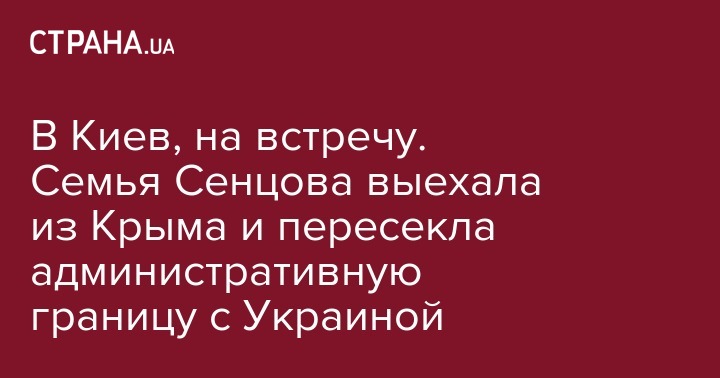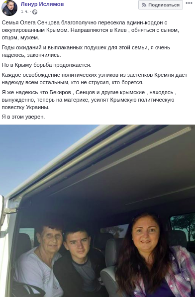 "Семья Олега Сенцова благополучно пересекла админграницу с оккупированным Крымом. Направляются в Киев, обняться с сыном, отцом, мужем. Годы ожиданий и выплаканных подушек для этой семьи, я очень надеюсь, закончились".