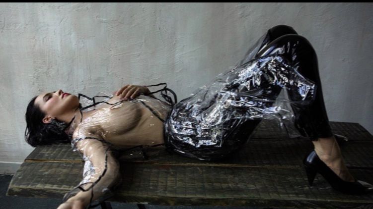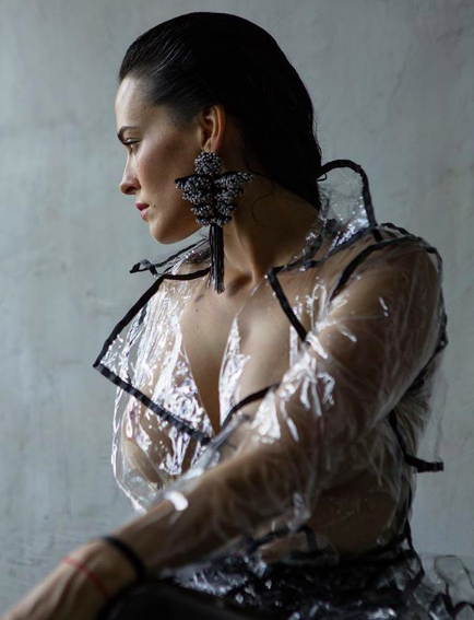 На фото Даша в прозрачном плаще-дождевике, под которым не было белья и на фото было отчетливо видно грудь певицы. Она дополнила образ лаковыми лосинами в обтяжку и туфлями на широком каблуке. Волосы были гладко зачесаны назад, из аксессуаров на фотосессию Астафьева надела крупные фигурные серьги с обилием камней и кисточками. Артистка позировала на деревянном столе.