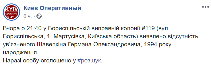В 21:40 понедельника, 14 октября, в Бориспольской исправительной колонии №119 (ул. Бориспольская, 1, Мартусовка, Киевская область) выявили отсутствие одного из заключенных. Им оказался Шавелкин Г.А., 1994 года рождения.