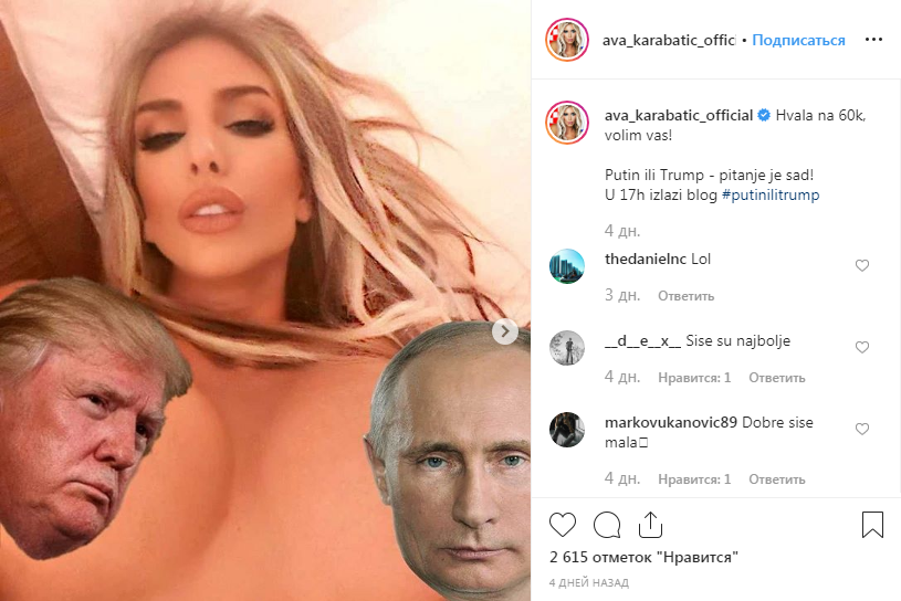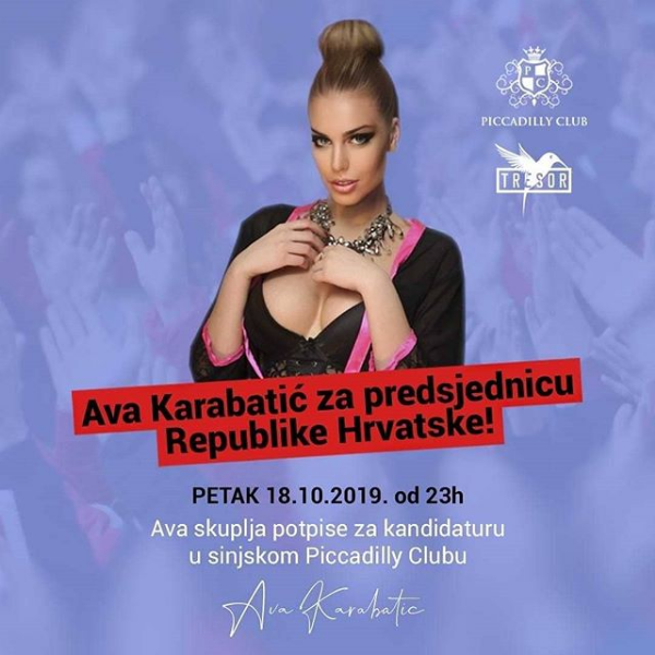 Модель журнала Playboy Ава Карабатич намерена баллотироваться в президенты Хорватии. Об этом она сообщила подписчикам в Instagram.