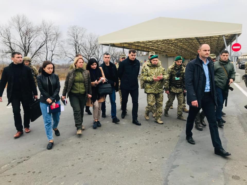 Премьер-министр Украины Алексей Гончарук и министр по делам ветеранов, временно оккупированных территорий и внутренне перемещенных лиц Оксана Коляда приехали на контрольный пункт въезда выезда Новотроицкое.