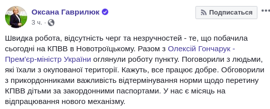"Быстрая работа, отсутствие очередей и неудобств - то, что увидела сегодня на КПВВ в Новотроицком. Вместе с Алексеем Гончаруком - премьер-министром Украины осмотрели работу пункта. Поговорили с людьми, которые ехали из оккупированной территории. Говорят, все работает хорошо", - сказала Коляда.