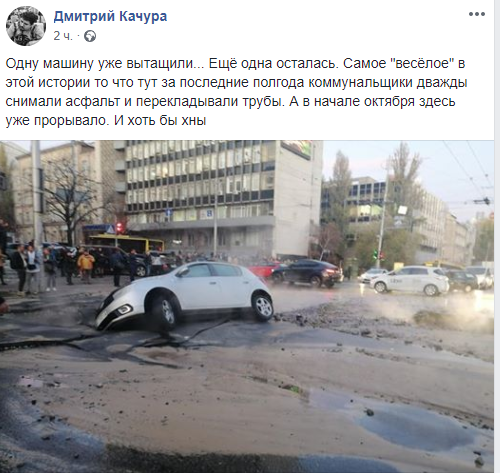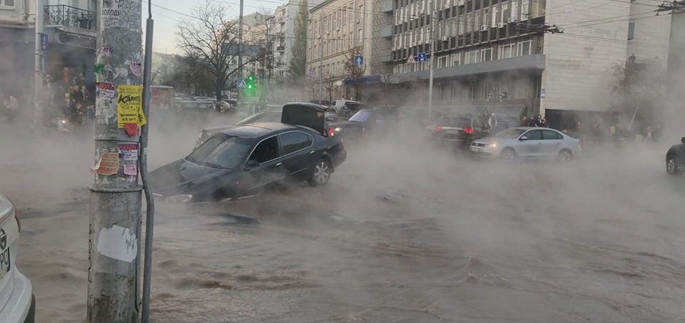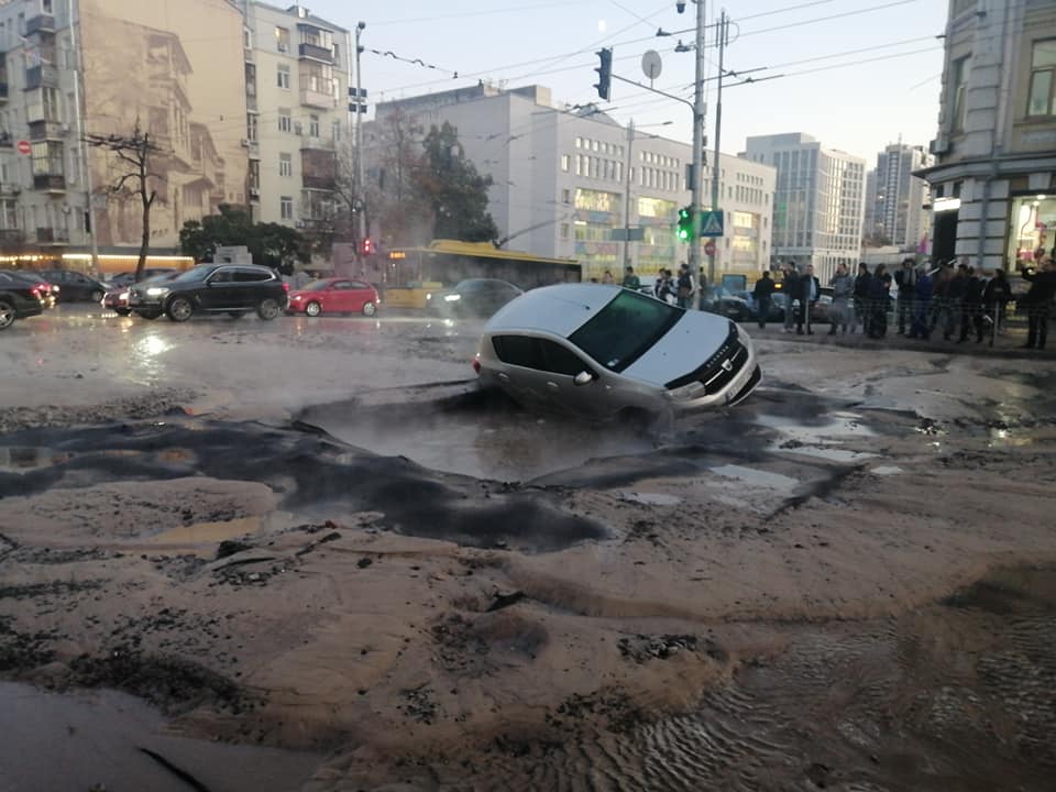 5 ноября в центре Киева, на пересечении улиц Саксаганского и Шота Руставели произошел масштабный порыв трубы, после которого по дороге потекли реки кипятка, асфальт провалился, а в ямы попали два автомобиля.