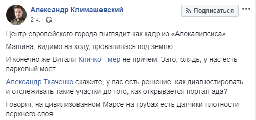 "Центр европейского города выглядит, как кадр из "Апокалипсиса". Машина, видимо, на ходу, провалилась под землю. И, конечно же, Виталя Кличко – мэр ни при чем. Зато, б@, у нас есть парковый мост.
