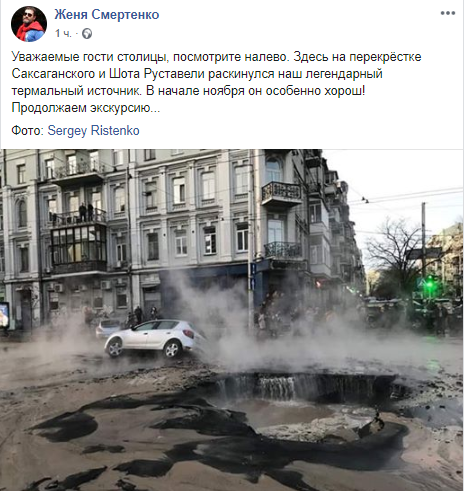 Некоторые предлагают устраивать экскурсии. "Уважаемые гости столицы, посмотрите налево. Здесь на перекрёстке Саксаганского и Шота Руставели раскинулся наш легендарный термальный источник. В начале ноября он особенно хорош! Продолжаем экскурсию..." – написал Евгений Смертенко.