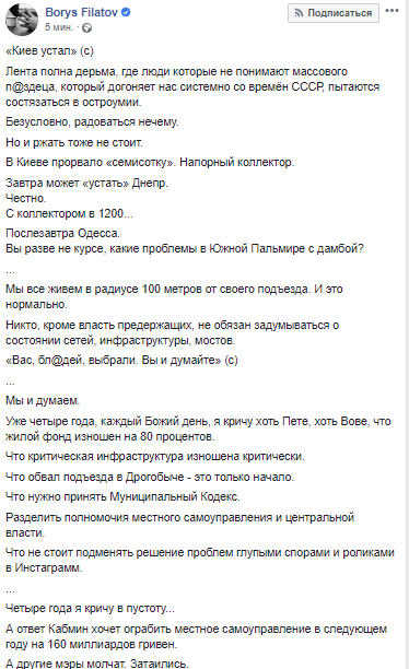 "Уже четыре года, каждый Божий день, я кричу хоть Пете, хоть Вове, что жилой фонд изношен на 80 процентов. Что критическая инфраструктура изношена критически. Что обвал подъезда в Дрогобыче – это только начало. Что нужно принять Муниципальный Кодекс. Разделить полномочия местного самоуправления и центральной власти. Что не стоит подменять решение проблем глупыми спорами и роликами в Инстаграм... Четыре года я кричу в пустоту... А ответ Кабмин хочет ограбить местное самоуправление в следующем году на 160 миллиардов гривен. А другие мэры молчат. Затаились. Как мыши. Но я буду кричать. Потому что даже один голос – это уже много".