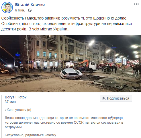 "Серьезность и масштаб вызовов понимают те, кто ежедневно их преодолевает. Особенно, после того, как обновлением инфраструктуры не занимались десятки лет. Во всех городах Украины..." – написал Кличко.
