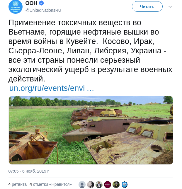 Пост был посвящен Международному дню предотвращения эксплуатации окружающей среды во время войны и вооруженных конфликтов, который отмечается 6 ноября. В подписи к твиту в российском представительстве ООН указали, какие страны понесли наиболее серьезный ущерб из-за военных действий, включив в список и Украину.
